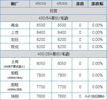 目前市場主流報價:410S熱軋黑皮在6050-6150元/噸;430熱軋黑皮在6650-6750元/噸,其中個別高位在6800元/噸左右;太鋼/酒鋼430/2B(毛)在7950-8000元/噸;聯(lián)眾430/2BA(毛)在7750-7800元/噸;宏旺430/2BA(毛)在7750-7800元/噸;甬金430/BA(毛)在8500元/噸左右;上克430/BA(毛)在8400元/噸左右;宏旺430/BA(毛)在8150-8200元/噸;瑞鋼430/2BA(毛)在7700-7800元/噸;聯(lián)成430/BA(毛)在8200元/噸左右。